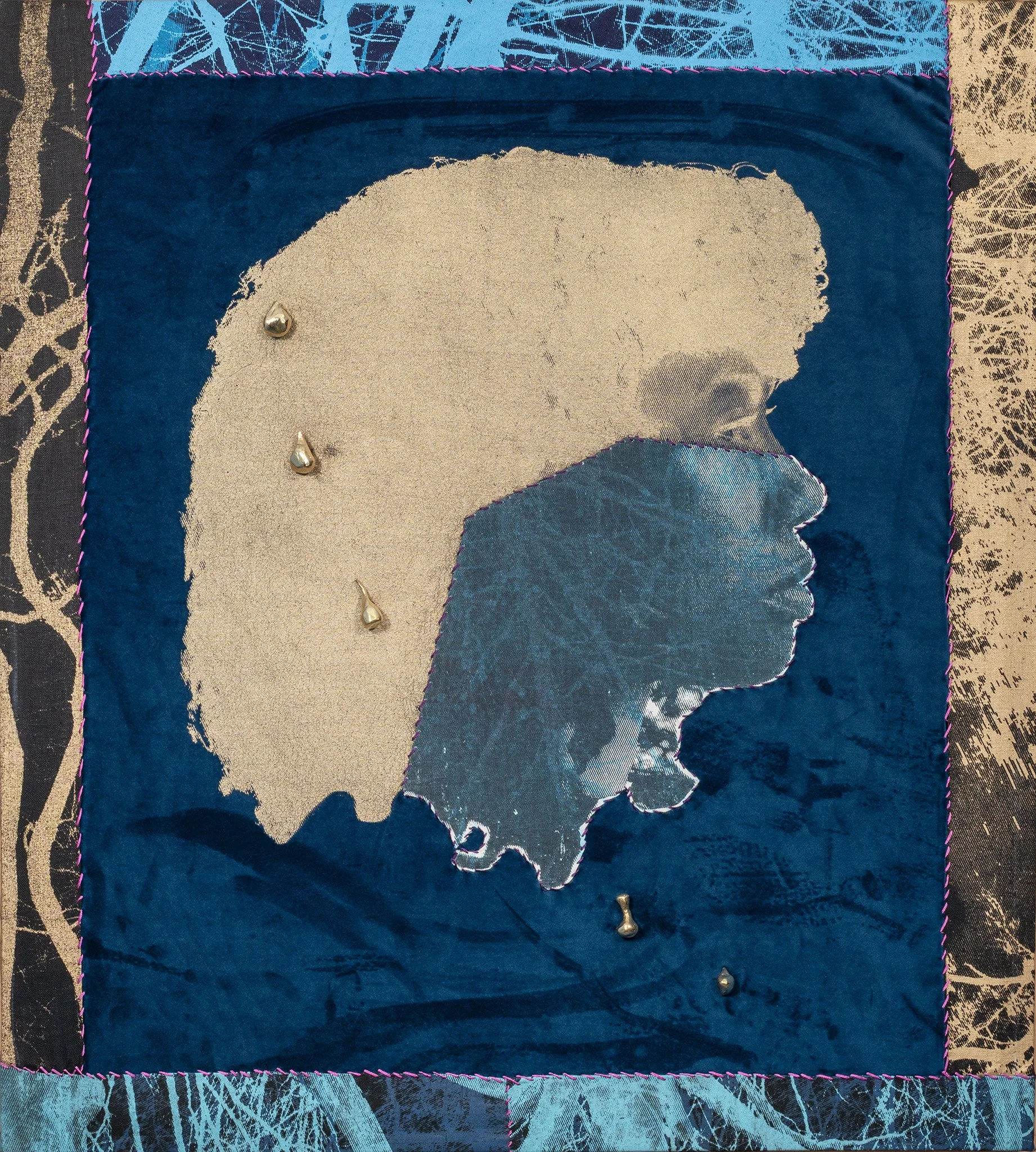 69 x 65cm, Screenprint on velvet & linen, brass tears applications, hand stitched, 2024