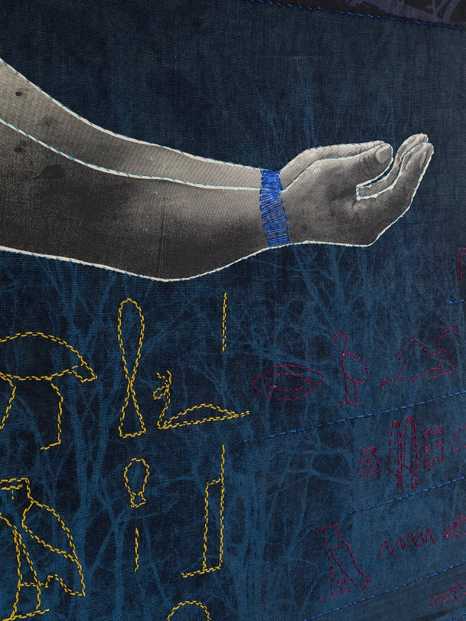 231.1 x 142.2 cm, Indigo dyed linen & screenprint, screenprint applications, embroidery, hand stitched, 2021